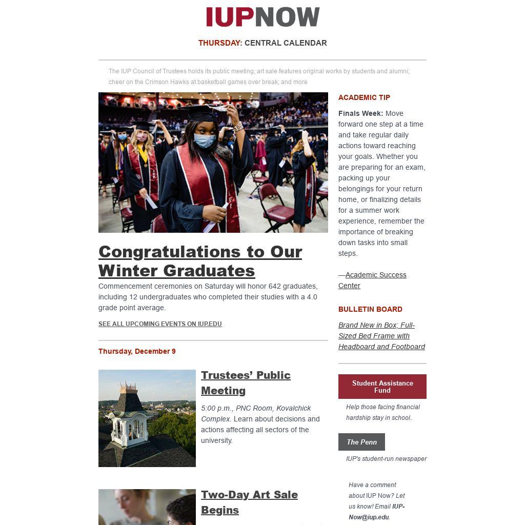 Distributed to IUP employees and students three days a week, IUP Now is the official newsletter of Indiana University of Pennsylvania. It features news from across the IUP website, compiled by the Division of Marketing and Communications. Find out how to get your news and events in IUP Now.