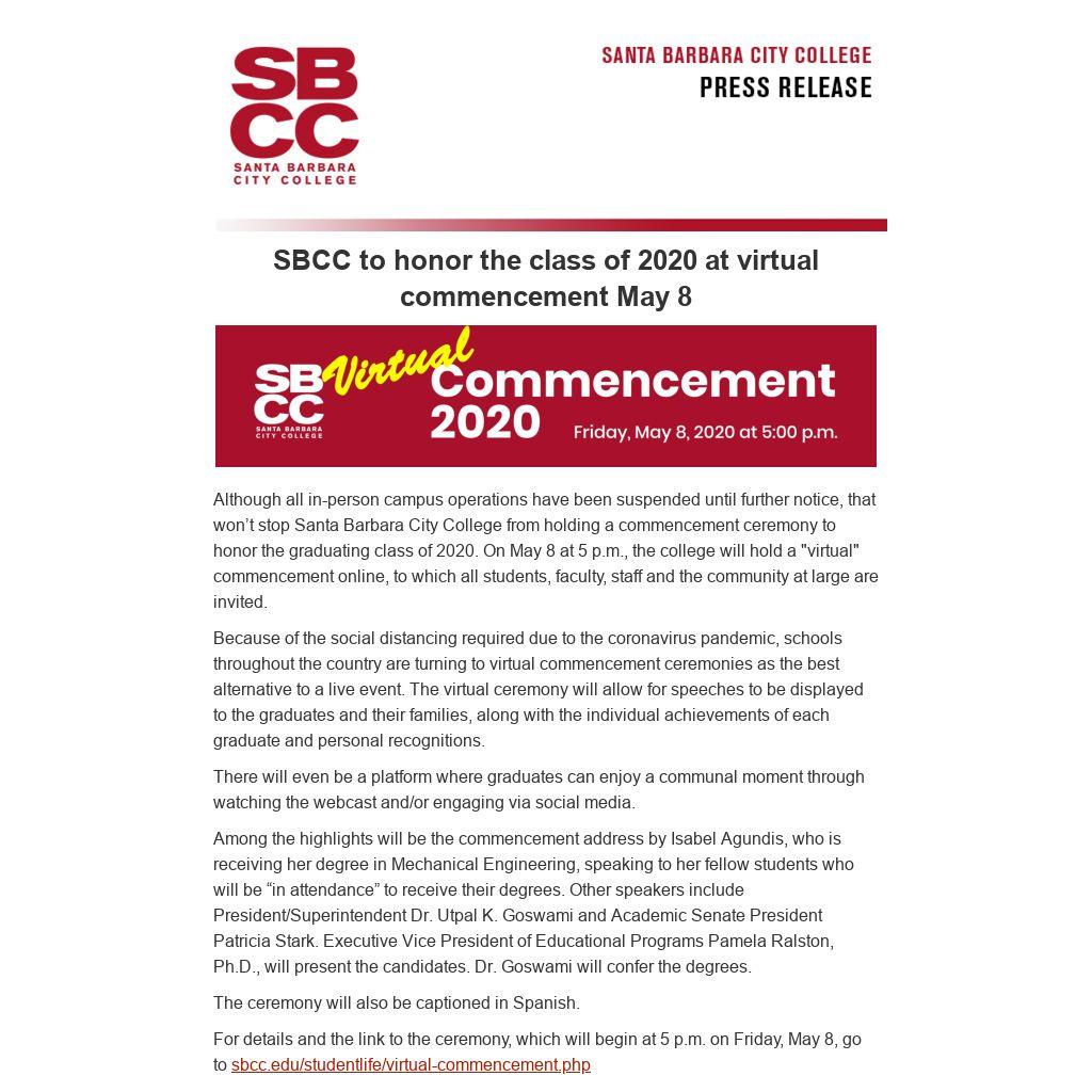 Although all in-person campus operations have been suspended until further notice, that won’t stop Santa Barbara City College from holding a commencement ceremony to honor the graduating class of 2020. On May 8 at 5 p.m., the college will hold a "virtual" commencement online, to which all students, faculty, staff and the community at large are invited.