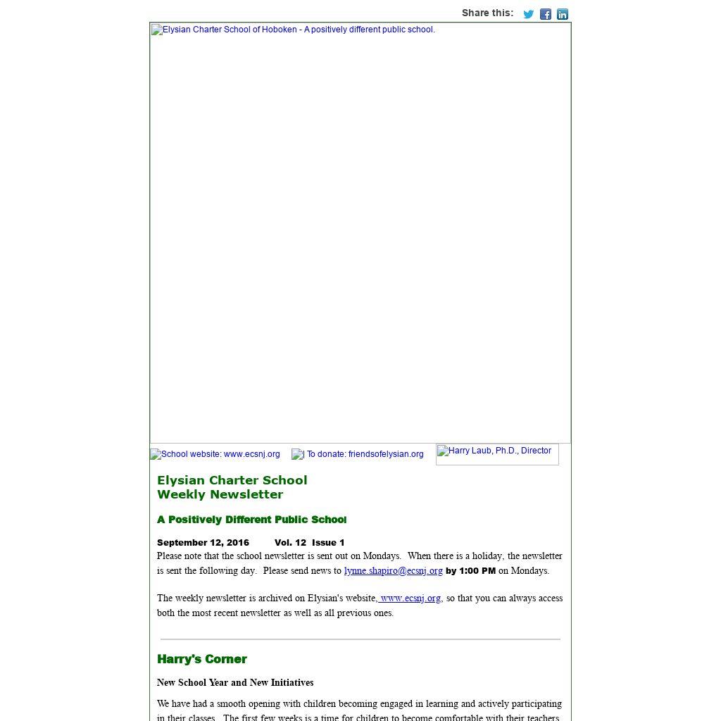 The weekly newsletter is archived on Elysian's website, www.ecsnj.org, so that you can always access both the most recent newsletter as well as all previous ones.