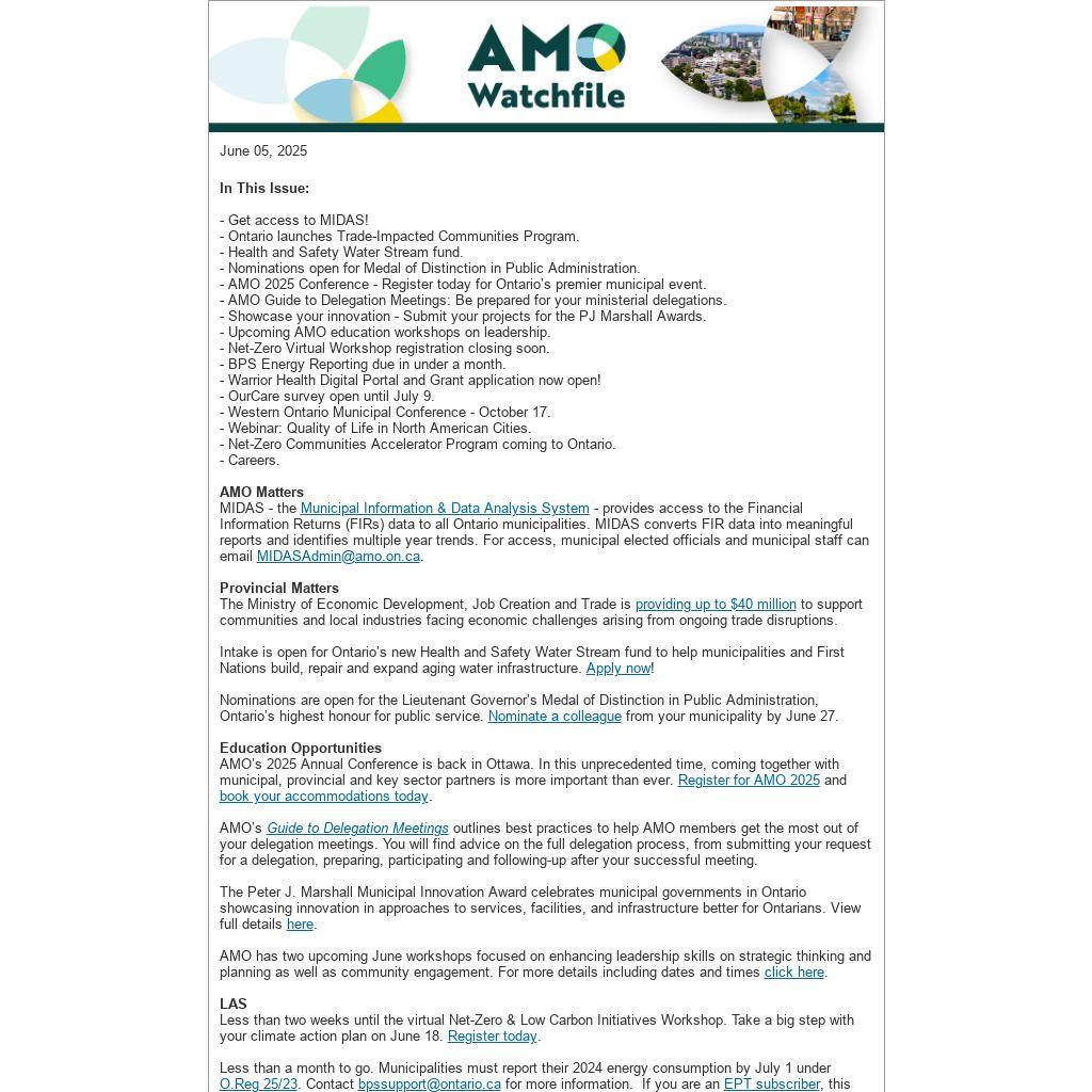 *Disclaimer: The Association of Municipalities of Ontario (AMO) is unable to provide any warranty regarding the accuracy or completeness of third-party submissions. Distribution of these items does not imply an endorsement of the views, information or services mentioned.