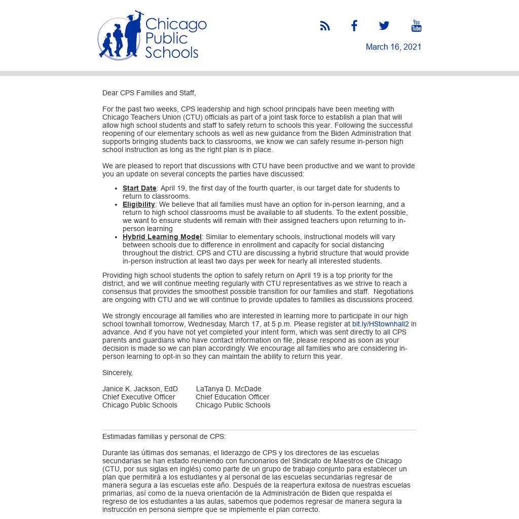 We strongly encourage all families who are interested in learning more to participate in our high school townhall tomorrow, Wednesday, March 17, at 5 p.m. Please register at bit.ly/HStownhall2 in advance. And if you have not yet completed your intent form, which was sent directly to all CPS parents and guardians who have contact information on file, please respond as soon as your decision is made so we can plan accordingly. We encourage all families who are considering in-person learning to opt-in so they can maintain the ability to return this year.