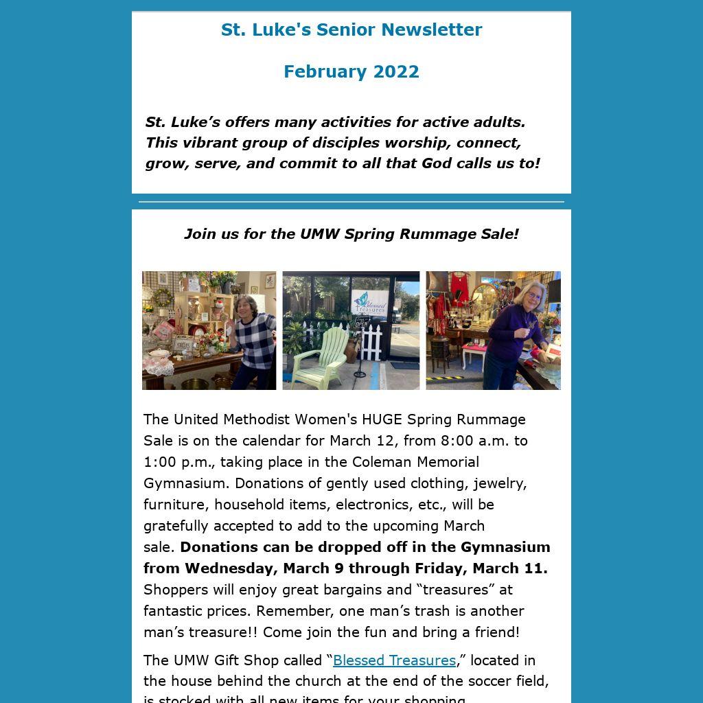 The United Methodist Women's HUGE Spring Rummage Sale is on the calendar for March 12, from 8:00 a.m. to 1:00 p.m., taking place in the Coleman Memorial Gymnasium. Donations of gently used clothing, jewelry, furniture, household items, electronics, etc., will be gratefully accepted to add to the upcoming March sale. Donations can be dropped off in the Gymnasium from Wednesday, March 9 through Friday, March 11. Shoppers will enjoy great bargains and “treasures” at fantastic prices. Remember, one man’s trash is another man’s treasure!! Come join the fun and bring a friend!