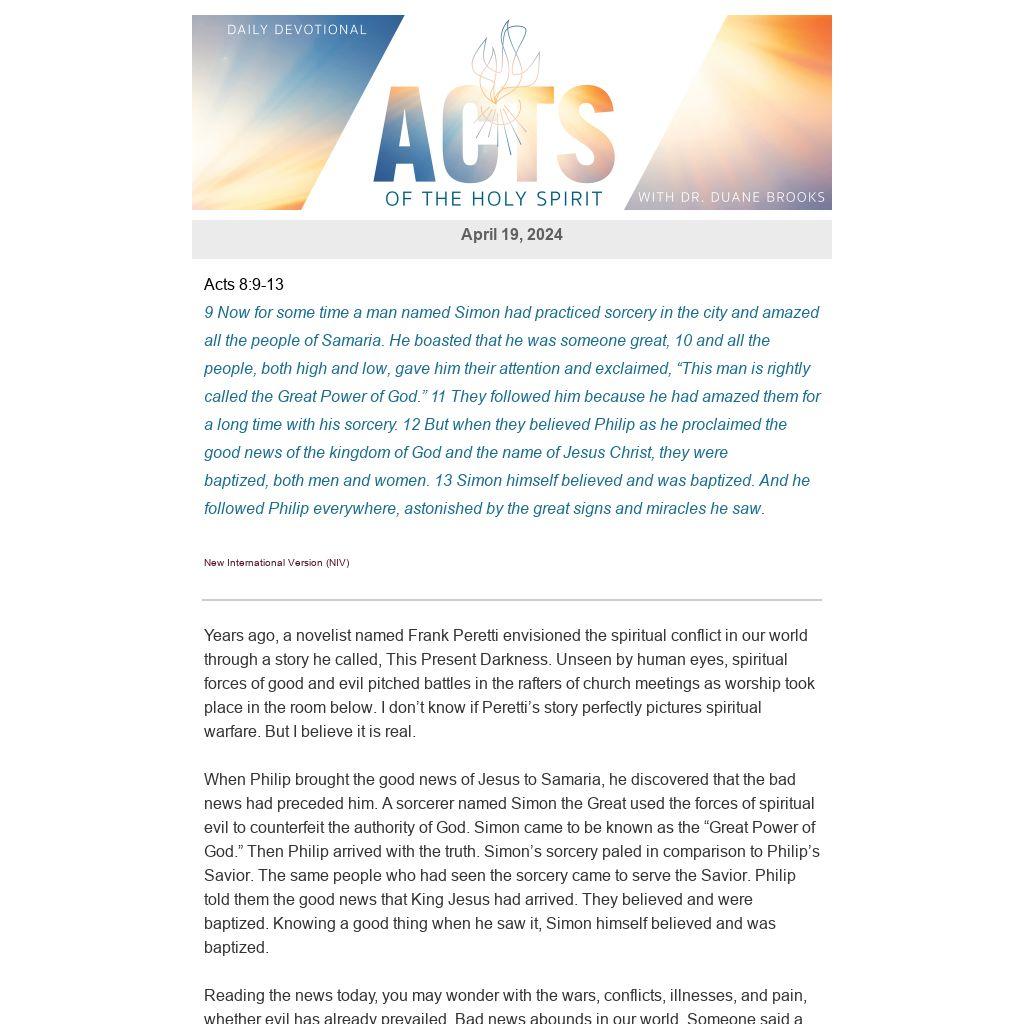 When Philip brought the good news of Jesus to Samaria, he discovered that the bad news had preceded him. A sorcerer named Simon the Great used the forces of spiritual evil to counterfeit the authority of God. Simon came to be known as the “Great Power of God.” Then Philip arrived with the truth. Simon’s sorcery paled in comparison to Philip’s Savior. The same people who had seen the sorcery came to serve the Savior. Philip told them the good news that King Jesus had arrived. They believed and were baptized. Knowing a good thing when he saw it, Simon himself believed and was baptized.