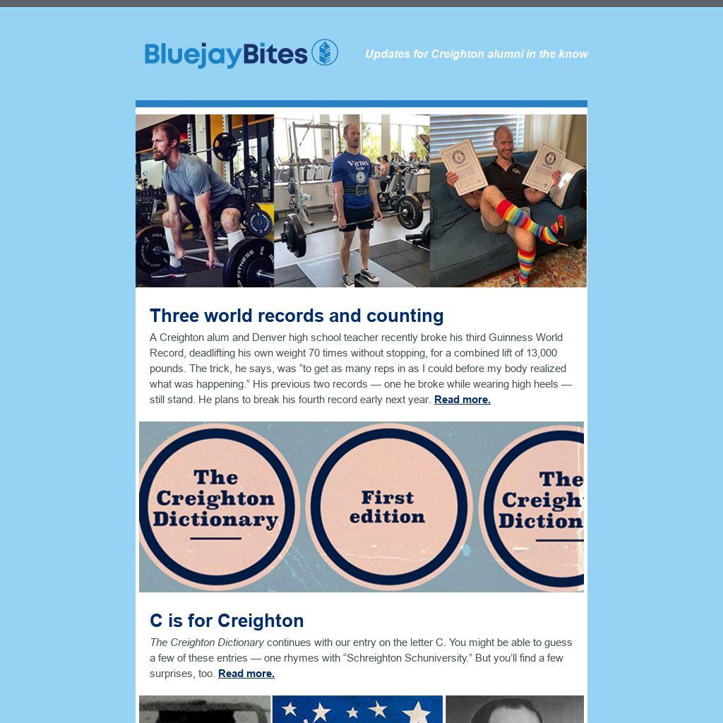 A Creighton alum and Denver high school teacher recently broke his third Guinness World Record, deadlifting his own weight 70 times without stopping, for a combined lift of 13,000 pounds. The trick, he says, was “to get as many reps in as I could before my body realized what was happening.” His previous two records — one he broke while wearing high heels — still stand. He plans to break his fourth record early next year. Read more.