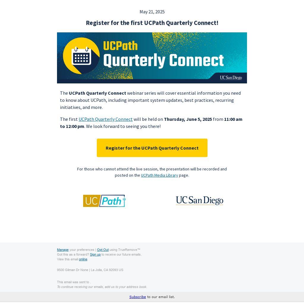 The first UCPath Quarterly Connect will be held on Thursday, June 5, 2025 from 11:00 am to 12:00 pm. We look forward to seeing you there!