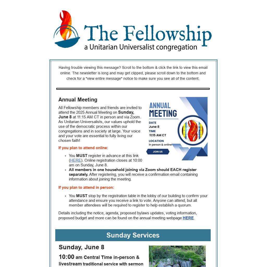 All Fellowship members and friends are invited to attend the 2025 Annual Meeting on Sunday, June 8 at 11:15 AM CT in person and via Zoom. As Unitarian Universalists, our values uphold the use of the democratic process within our congregations and in society at large. Your voice and your vote are essential to fully living our chosen faith!