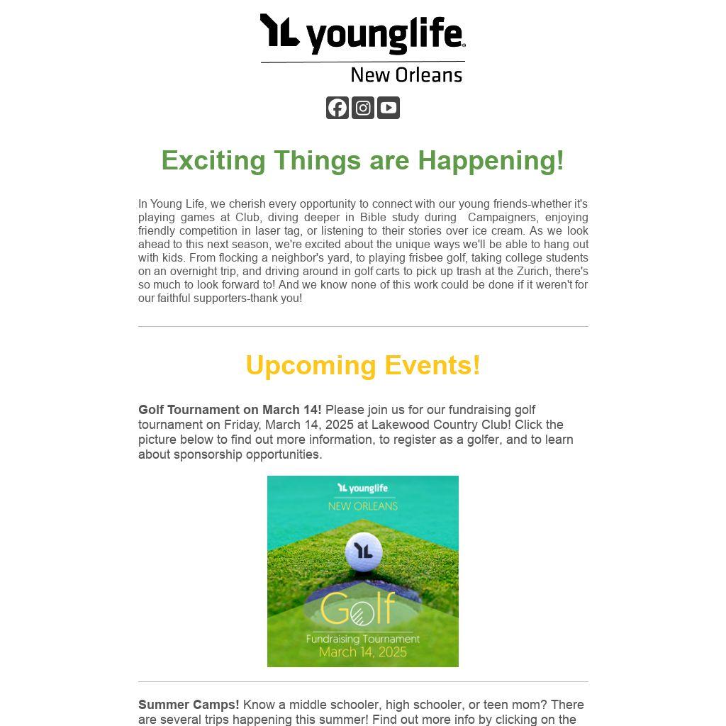 In Young Life, we cherish every opportunity to connect with our young friends-whether it's playing games at Club, diving deeper in Bible study during Campaigners, enjoying friendly competition in laser tag, or listening to their stories over ice cream. As we look ahead to this next season, we're excited about the unique ways we'll be able to hang out with kids. From flocking a neighbor's yard, to playing frisbee golf, taking college students on an overnight trip, and driving around in golf carts to pick up trash at the Zurich, there's so much to look forward to! And we know none of this work could be done if it weren't for our faithful supporters-thank you!