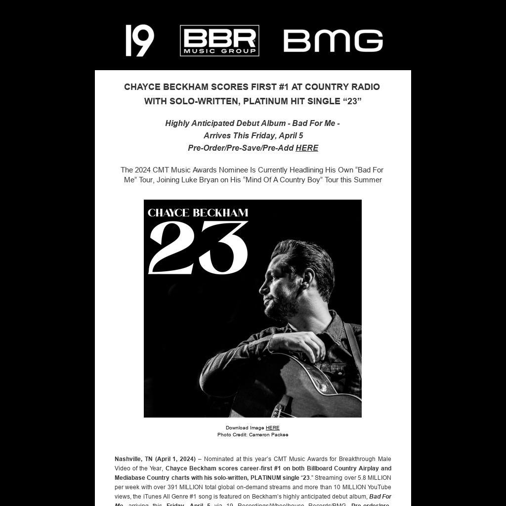 Nashville, TN (April 1, 2024) – Nominated at this year’s CMT Music Awards for Breakthrough Male Video of the Year, Chayce Beckham scores career-first #1 on both Billboard Country Airplay and Mediabase Country charts with his solo-written, PLATINUM single 23.” Streaming over 5.8 MILLION per week with over 391 MILLION total global on-demand streams and more than 10 MILLION YouTube views, the iTunes All Genre #1 song is featured on Beckham’s highly anticipated debut album, Bad For Me, arriving this Friday, April 5 via 19 Recordings/Wheelhouse Records/BMG. Pre-order/pre-save/pre-add the album HERE.