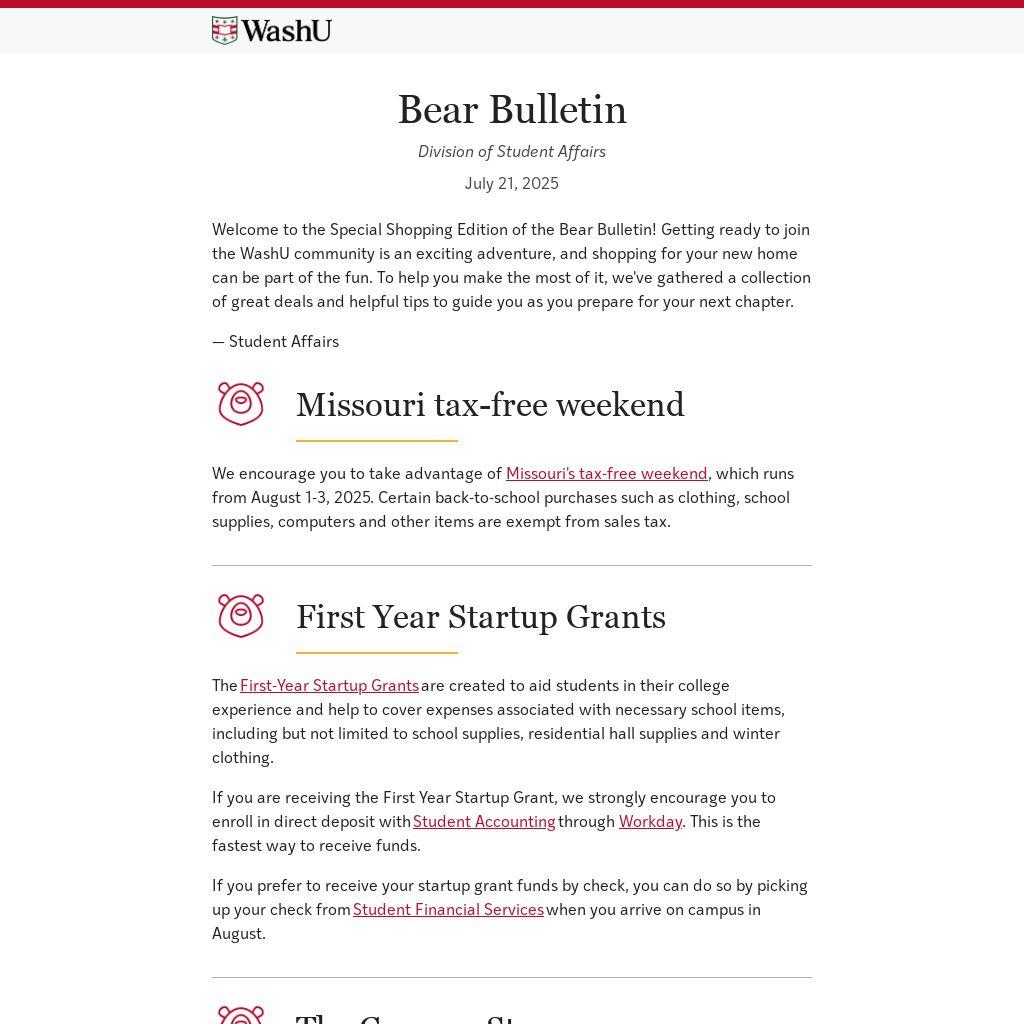 Welcome to the Special Shopping Edition of the Bear Bulletin! Getting ready to join the WashU community is an exciting adventure, and shopping for your new home can be part of the fun. To help you make the most of it, we've gathered a collection of great deals and helpful tips to guide you as you prepare for your next chapter.