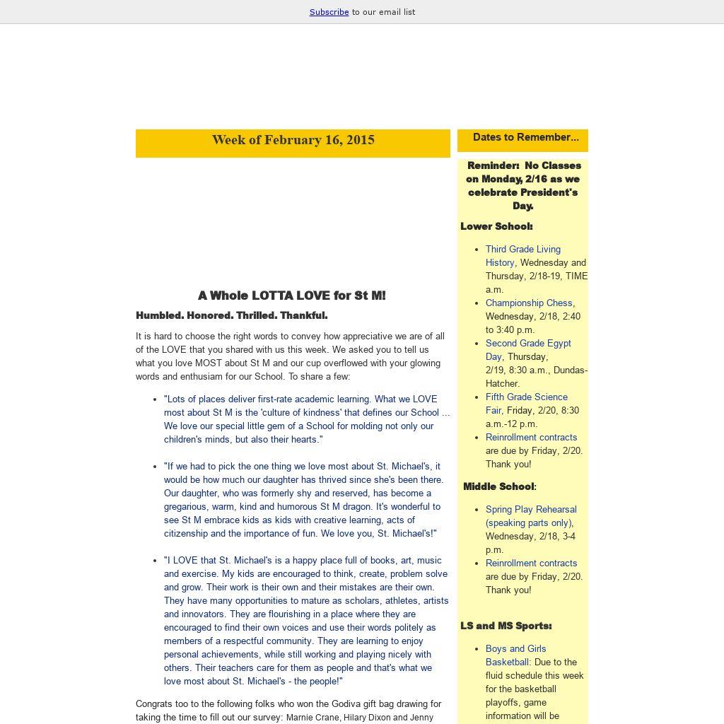 - "If we had to pick the one thing we love most about St. Michael's, it would be how much our daughter has thrived since she's been there. Our daughter, who was formerly shy and reserved, has become a gregarious, warm, kind and humorous St M dragon. It's wonderful to see St M embrace kids as kids with creative learning, acts of citizenship and the importance of fun. We love you, St. Michael's!"