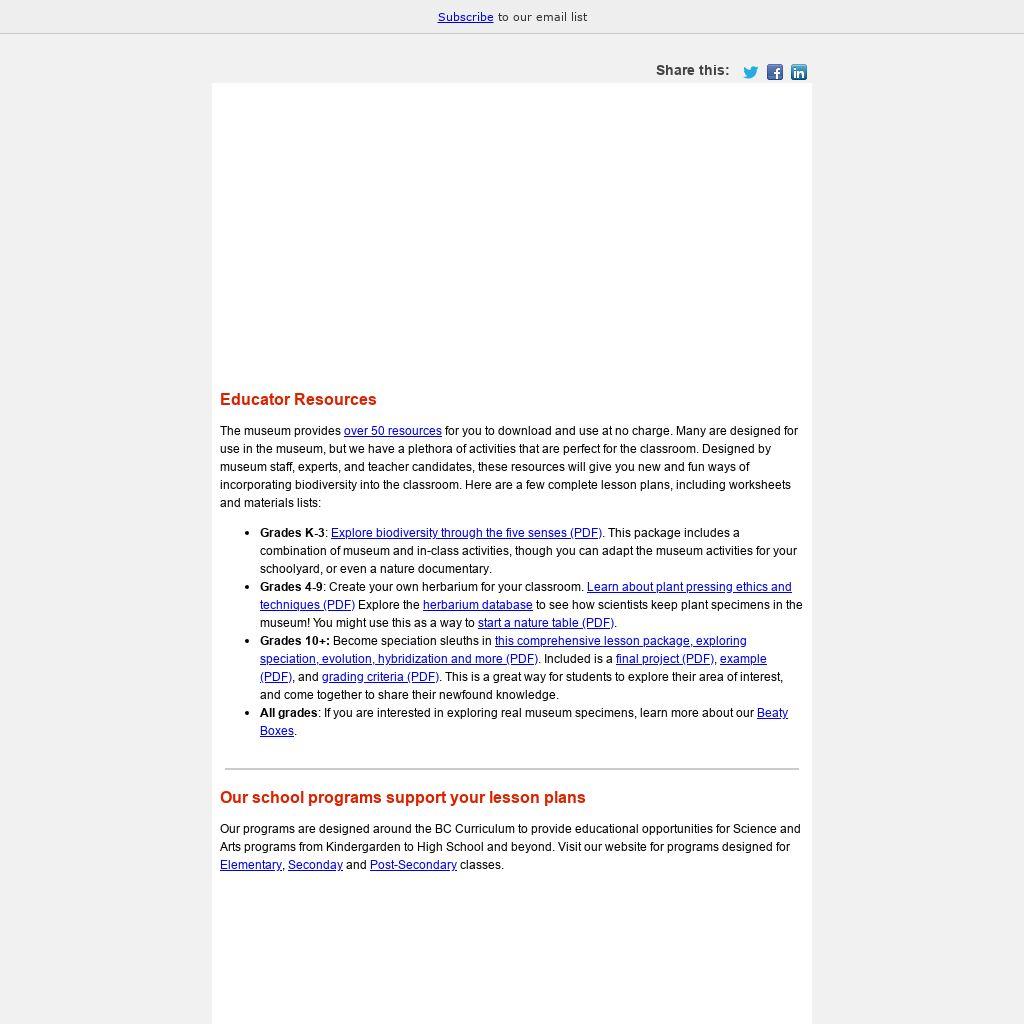 The museum provides over 50 resources for you to download and use at no charge. Many are designed for use in the museum, but we have a plethora of activities that are perfect for the classroom. Designed by museum staff, experts, and teacher candidates, these resources will give you new and fun ways of incorporating biodiversity into the classroom. Here are a few complete lesson plans, including worksheets and materials lists: