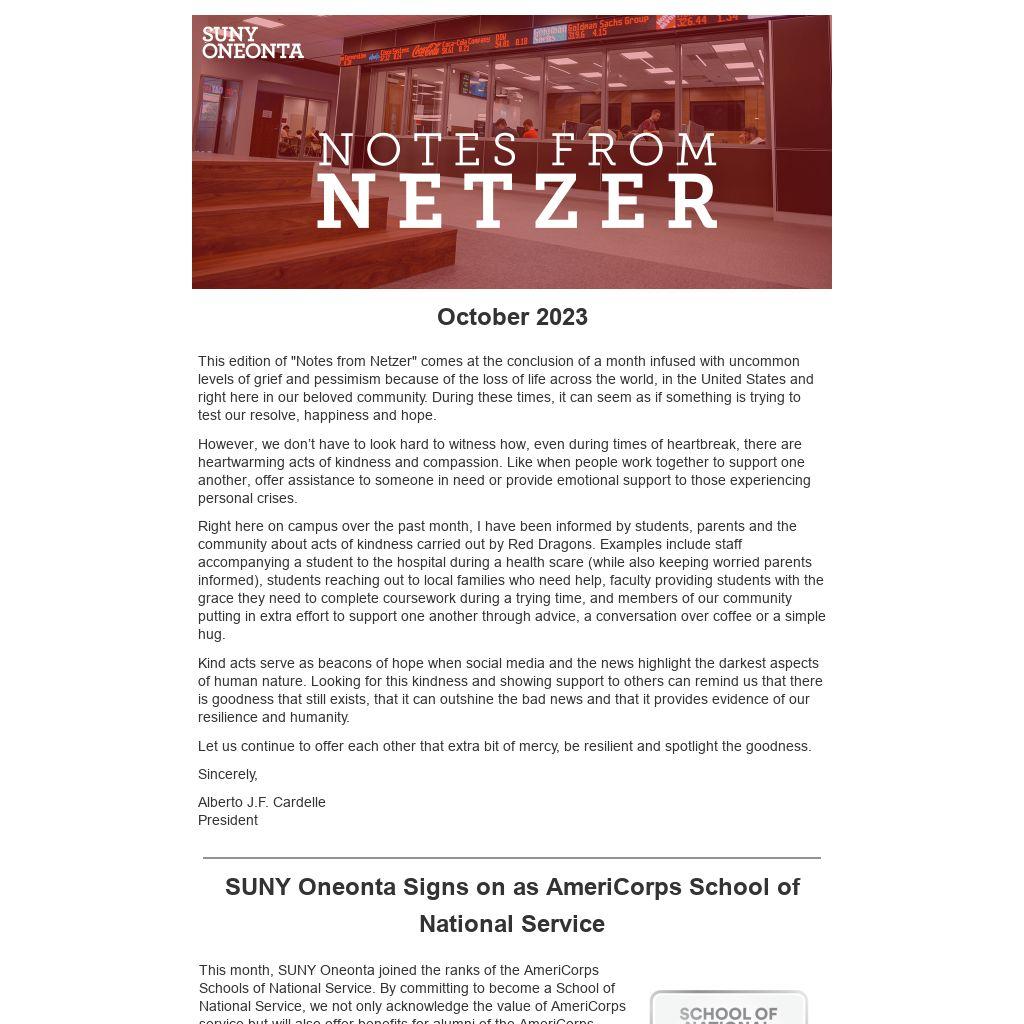 Notes from meetings of the President's Cabinet are shared with the university community monthly in Notes from Netzer. Questions can be directed to president@oneonta.edu.