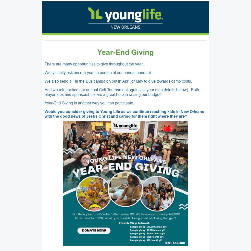 Would you consider giving to Young Life as we continue reaching kids in New Orleans with the good news of Jesus Christ and caring for them right where they are?