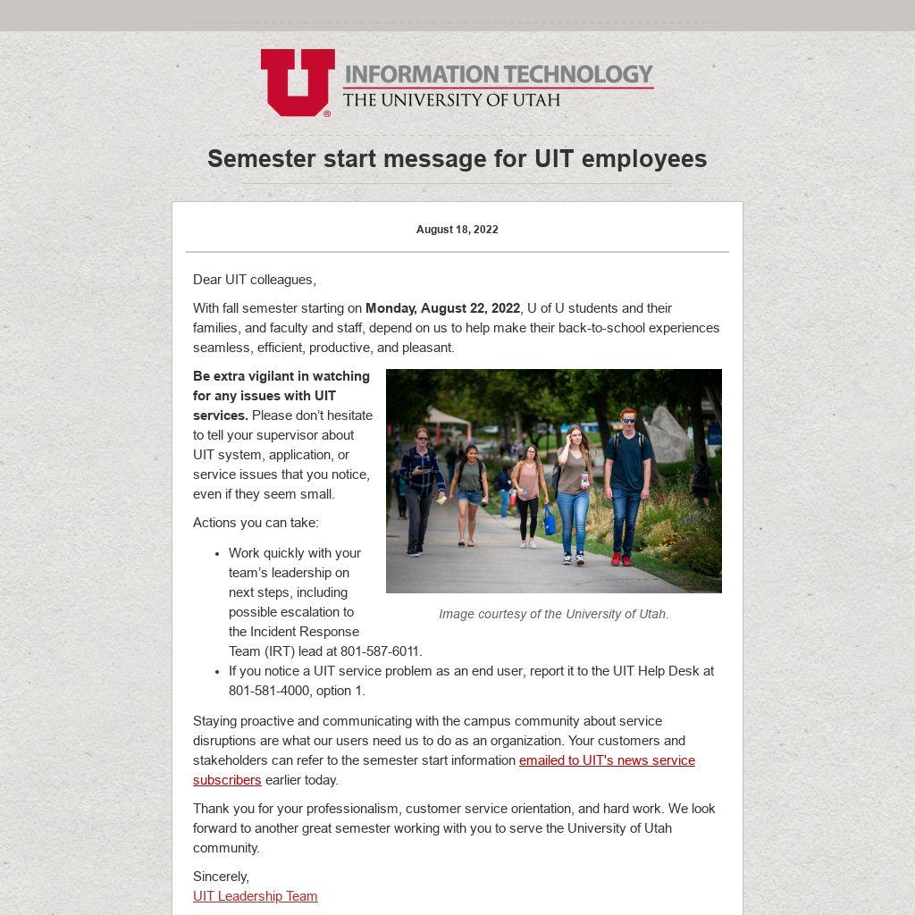 With fall semester starting on Monday, August 22, 2022, U of U students and their families, and faculty and staff, depend on us to help make their back-to-school experiences seamless, efficient, productive, and pleasant.