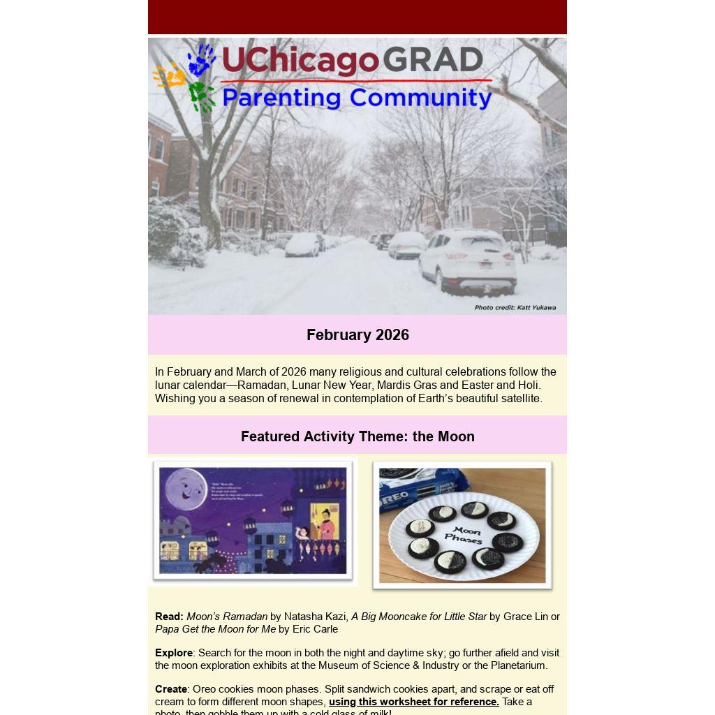 Saturday, February 28, 3:00–5:00 p.m., UChicagoGRAD Headquarters (970 E. 58th Street, 3rd Floor) Come and celebrate with fellow families at this free event featuring seasonal crafts, snacks and little prizes for kids. You can also sample the King Cake recipe above! RSVP is appreciated but not required to lmacgregor@uchicago.edu. While we are gathering in a UChicagoGRAD space, all families are invited—not just Grad students. Bring a friend!