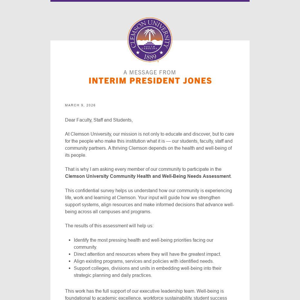 That is why I am asking every member of our community to participate in the Clemson University Community Health and Well-Being Needs Assessment.