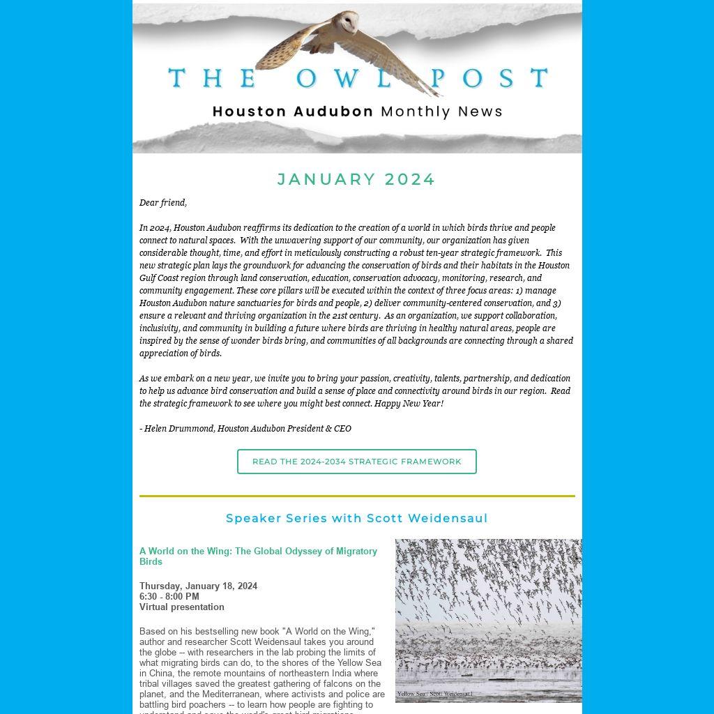 In 2024, Houston Audubon reaffirms its dedication to the creation of a world in which birds thrive and people connect to natural spaces. Â With the unwavering support of our community, our organization has given considerable thought, time, and effort in meticulously constructing a robust ten-year strategic framework. Â This new strategic plan lays the groundwork for advancing the conservation of birds and their habitats in the Houston Gulf Coast region through land conservation, education, conservation advocacy, monitoring, research, and community engagement. These core pillars will be executed within the context of three focus areas: 1) manage Houston Audubon nature sanctuaries for birds and people, 2) deliver community-centered conservation, and 3) ensure a relevant and thriving organization in the 21st century. Â As an organization, we support collaboration, inclusivity, and community in building a future where birds are thriving in healthy natural areas, people are inspired by the sense of wonder birds bring, and communities of all backgrounds are connecting through a shared appreciation of birds.