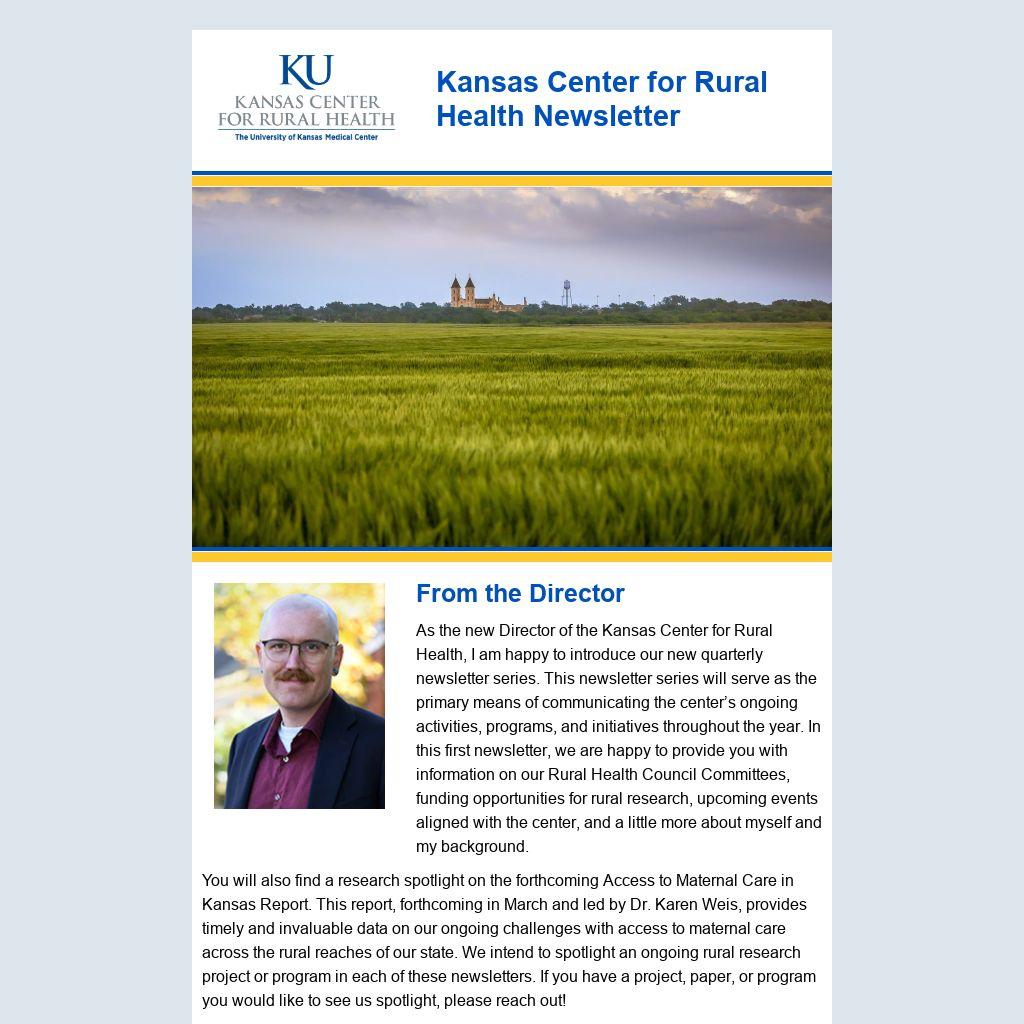 The Kansas Center for Rural Health continues to pursue its mission focused on identifying and reducing rural health disparities and improving the rural healthcare workforce and care delivery across the state of Kansas. As we continue to develop programs in our two primary avenues of education and research, you will find information on these growing programs both in these newsletters and on our website—which we are actively updating and where we have begun adding new resources for both public audiences and KUMC. If you have never engaged with the center, or have not engaged with us recently, I encourage you to reach out and consider joining one of our committees, detailed later in the newsletter. By participating in these committees, you can help organize efforts to advance rural health in Kansas, while also expanding your network of collaborators and partners.