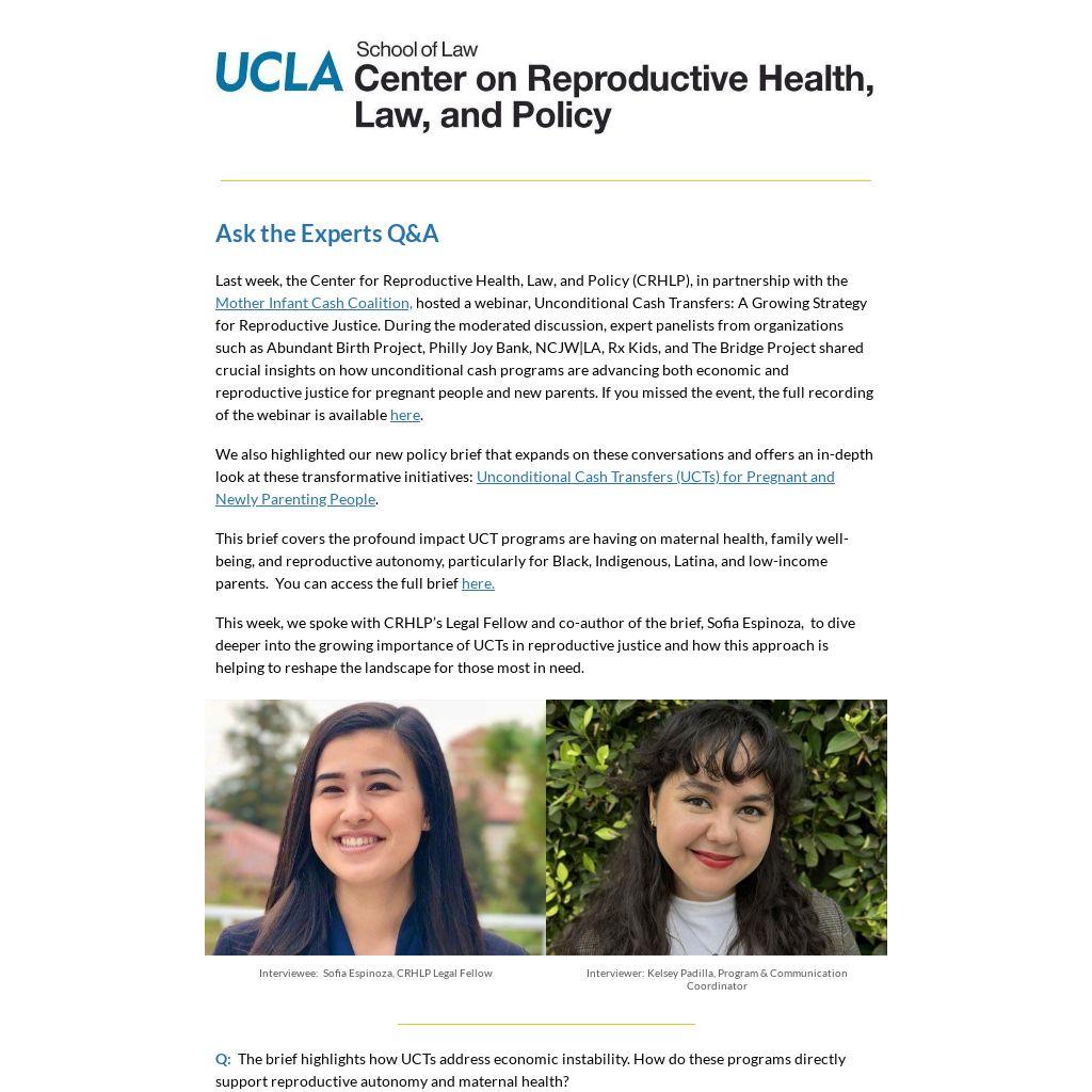 Last week, the Center for Reproductive Health, Law, and Policy (CRHLP), in partnership with the Mother Infant Cash Coalition, hosted a webinar, Unconditional Cash Transfers: A Growing Strategy for Reproductive Justice. During the moderated discussion, expert panelists from organizations such as Abundant Birth Project, Philly Joy Bank, NCJW|LA, Rx Kids, and The Bridge Project shared crucial insights on how unconditional cash programs are advancing both economic and reproductive justice for pregnant people and new parents. If you missed the event, the full recording of the webinar is available here.