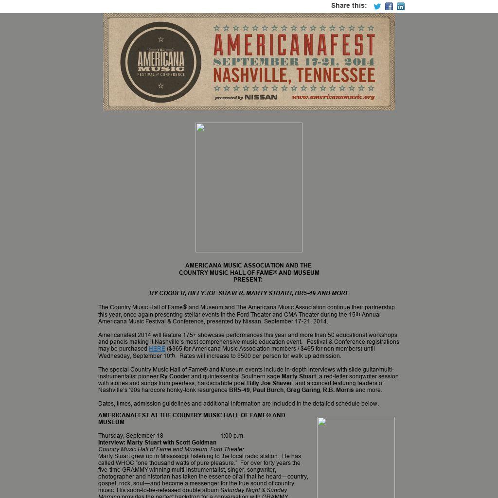 The Country Music Hall of Fame® and Museum and The Americana Music Association continue their partnership this year, once again presenting stellar events in the Ford Theater and CMA Theater during the 15th Annual Americana Music Festival & Conference, presented by Nissan, September 17-21, 2014.
