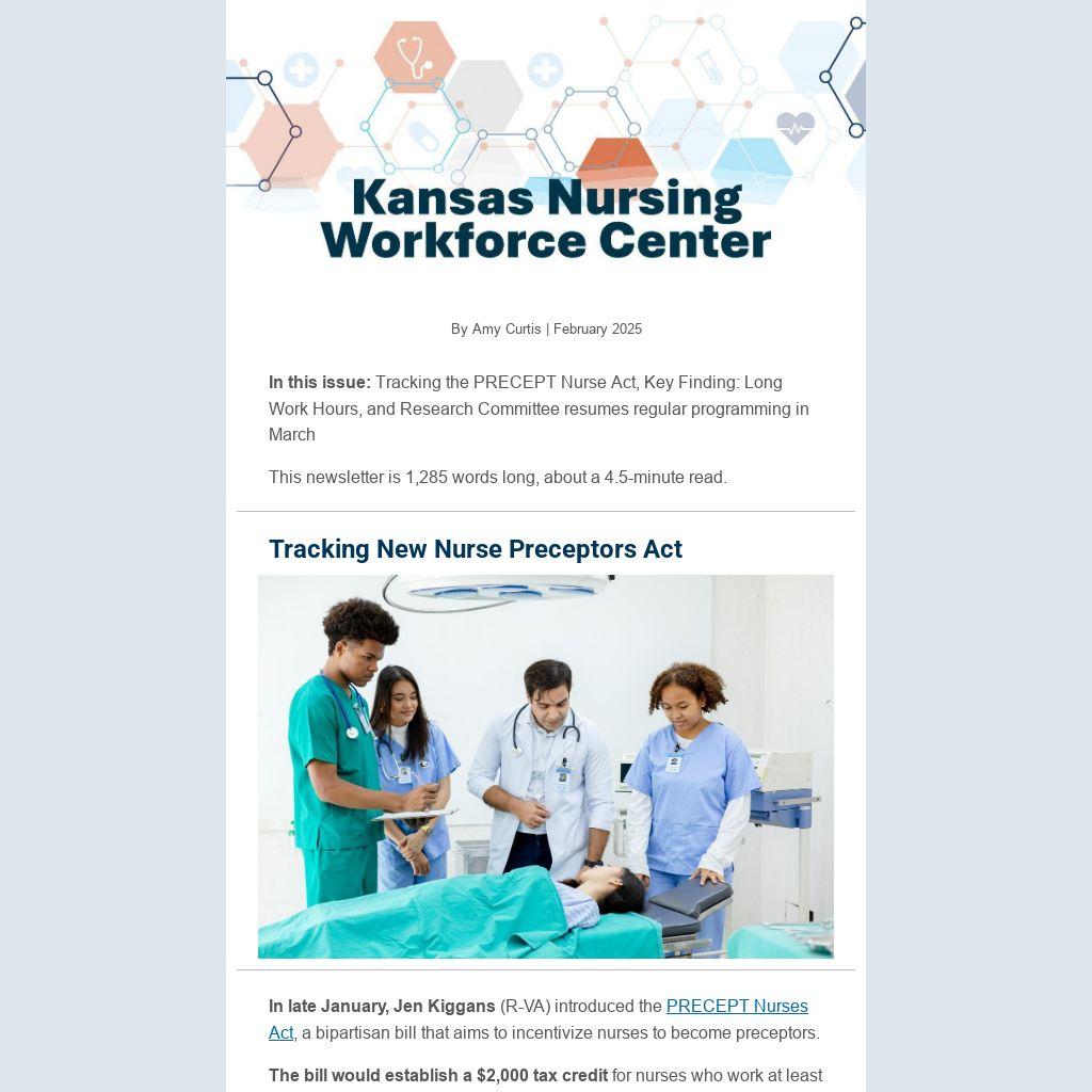 In this issue: Tracking the PRECEPT Nurse Act, Key Finding: Long Work Hours, and Research Committee resumes regular programming in March