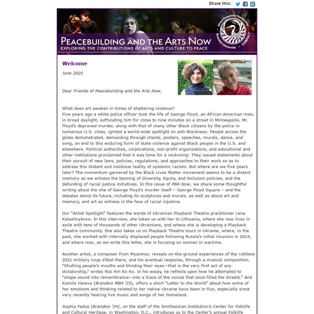 What does art awaken in times of shattering violence? Five years ago a white police officer took the life of George Floyd, an African American man, in broad daylight, suffocating him for close to nine minutes on a street in Minneapolis. Mr. Floyd’s depraved murder, along with that of many other Black citizens by the police in numerous U.S. cities, ignited a world-wide spotlight on anti-Blackness. People across the globe demonstrated, demanding through chants, posters, speeches, murals, dance, and song, an end to this enduring form of state violence against Black people in the U.S. and elsewhere. Political authorities, corporations, non-profit organizations, and educational and other institutions proclaimed that it was time for a reckoning: They issued statements about their pursuit of new laws, policies, regulations, and approaches to their work so as to address this blatant and insidious reality of systemic racism. But where are we five years later? The momentum garnered by the Black Lives Matter movement seems to be a distant memory as we witness the banning of Diversity, Equity, and Inclusion policies, and the defunding of racial justice initiatives. In this issue of PBA Now, we share some thoughtful writing about the site of George Floyd’s murder itself – George Floyd Square – and the debates about its future, including its sculptures and murals, as well as about art and memory, and art as witness in the face of racial injustice.