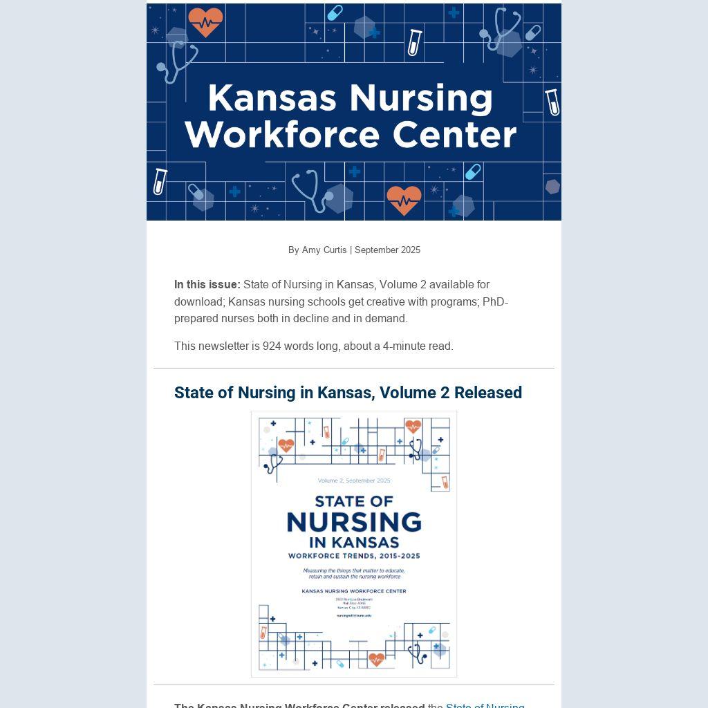 In this issue: State of Nursing in Kansas, Volume 2 available for download; Kansas nursing schools get creative with programs; PhD-prepared nurses both in decline and in demand.