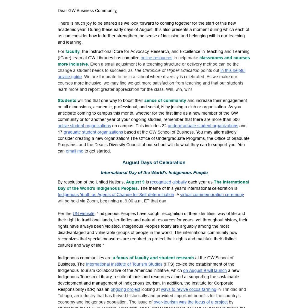 Dear GW Business Community, There is much joy to be shared as we look forward to coming together for the start of this new academic year. During these early days of August, this also presents a moment during which each of us can consider how to further strengthen the sense of inclusion and belonging within our teaching and learning.