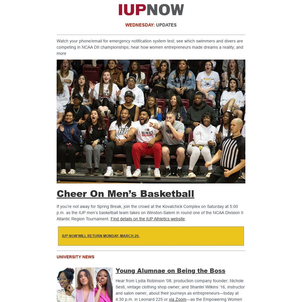 Distributed to IUP employees and students twice a week, IUP Now is the official newsletter of Indiana University of Pennsylvania. It features news from across the IUP website, compiled by the Division of Marketing and Communications. Find out how to get your news and events in IUP Now.