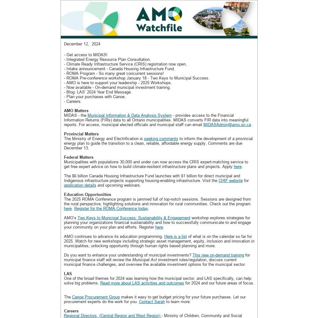 *Disclaimer: The Association of Municipalities of Ontario (AMO) is unable to provide any warranty regarding the accuracy or completeness of third-party submissions. Distribution of these items does not imply an endorsement of the views, information or services mentioned.
