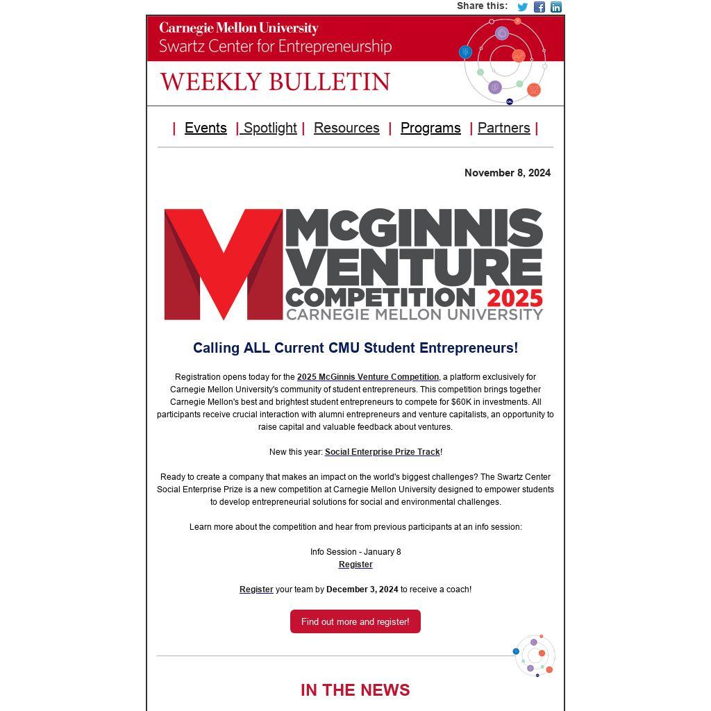Registration opens today for the 2025 McGinnis Venture Competition, a platform exclusively for Carnegie Mellon University's community of student entrepreneurs. This competition brings together Carnegie Mellon's best and brightest student entrepreneurs to compete for $60K in investments. All participants receive crucial interaction with alumni entrepreneurs and venture capitalists, an opportunity to raise capital and valuable feedback about ventures.