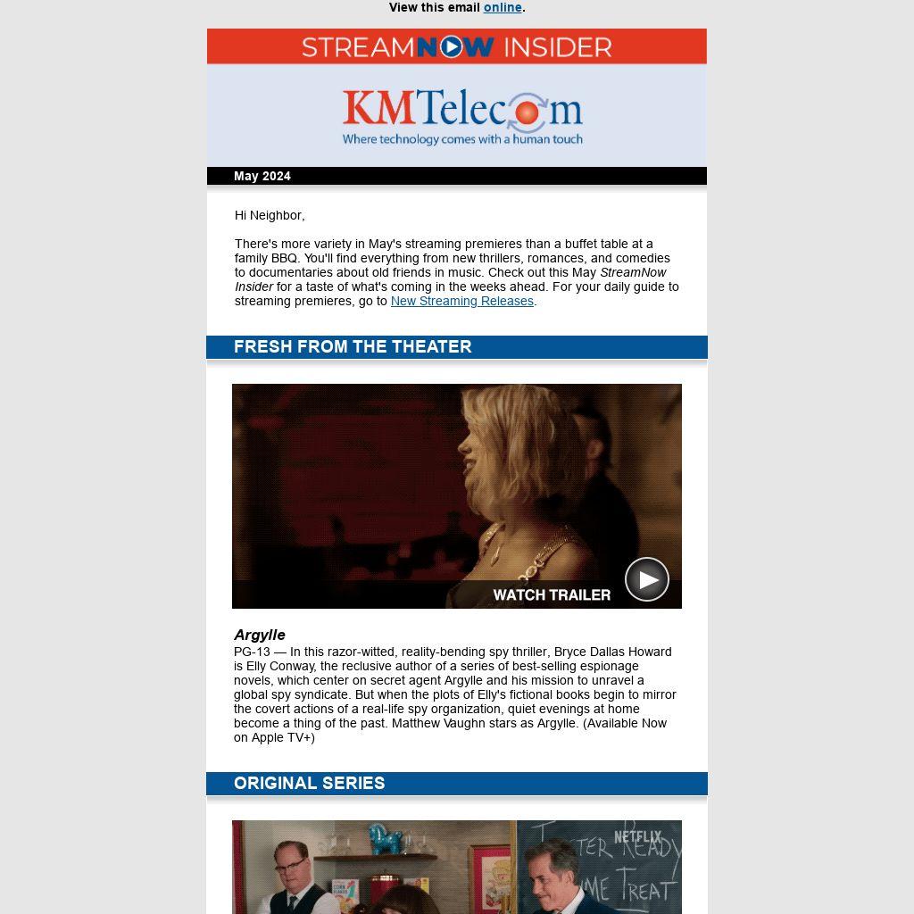 There's more variety in May's streaming premieres than a buffet table at a family BBQ. You'll find everything from new thrillers, romances, and comedies to documentaries about old friends in music. Check out this May StreamNow Insider for a taste of what's coming in the weeks ahead. For your daily guide to streaming premieres, go to New Streaming Releases. |