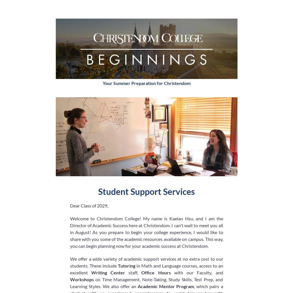 You are in my prayers this summer as you prepare to come to Christendom. If you have questions about our academic support services or would simply like to introduce yourself, feel free to contact me anytime (kaelan.hsu@christendom.edu or 540-551-9177). See you soon!