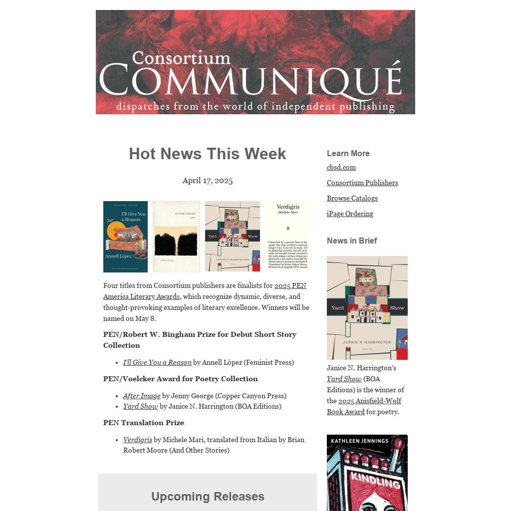 | Four titles from Consortium publishers are finalists for 2025 PEN America Literary Awards, which recognize dynamic, diverse, and thought-provoking examples of literary excellence. Winners will be named on May 8.