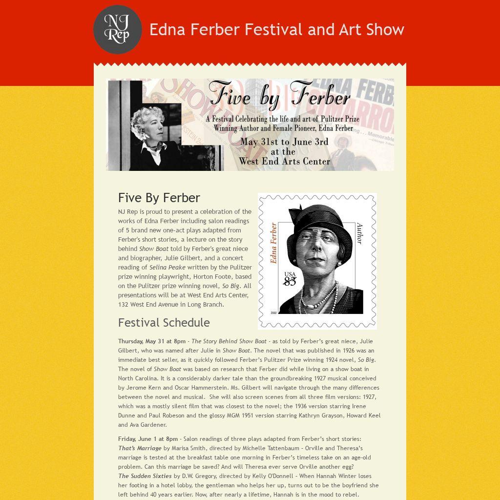 NJ Rep is proud to present a celebration of the works of Edna Ferber including salon readings of 5 brand new one-act plays adapted from Ferber's short stories, a lecture on the story behind Show Boat told by Ferber's great niece and biographer, Julie Gilbert, and a concert reading of Selina Peake written by the Pulitzer prize winning playwright, Horton Foote, based on the Pulitzer prize winning novel, So Big. All presentations will be at West End Arts Center, 132 West End Avenue in Long Branch.