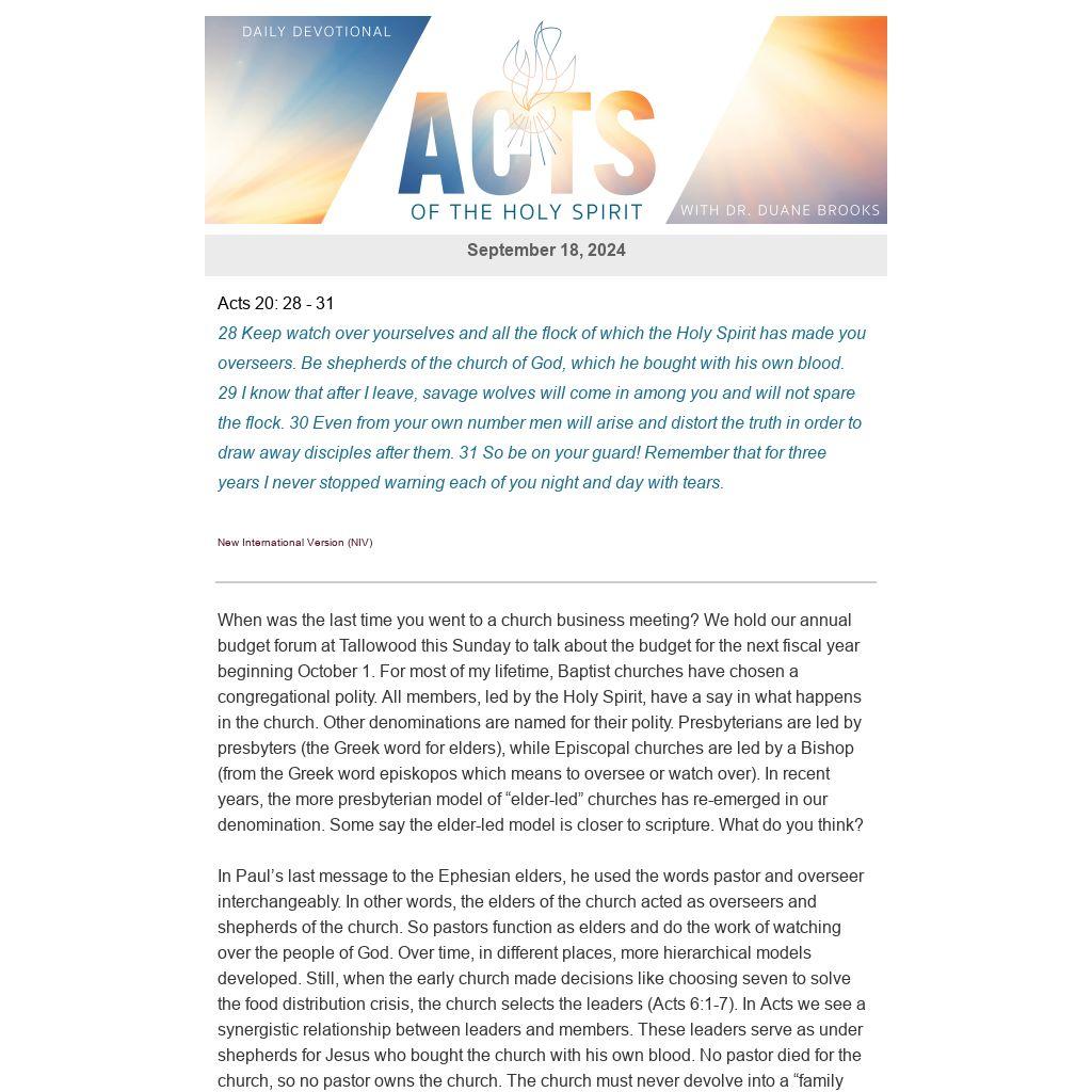 When was the last time you went to a church business meeting? We hold our annual budget forum at Tallowood this Sunday to talk about the budget for the next fiscal year beginning October 1. For most of my lifetime, Baptist churches have chosen a congregational polity. All members, led by the Holy Spirit, have a say in what happens in the church. Other denominations are named for their polity. Presbyterians are led by presbyters (the Greek word for elders), while Episcopal churches are led by a Bishop (from the Greek word episkopos which means to oversee or watch over). In recent years, the more presbyterian model of “elder-led” churches has re-emerged in our denomination. Some say the elder-led model is closer to scripture. What do you think?