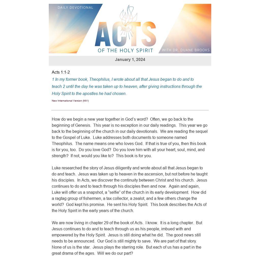 How do we begin a new year together in God’s word? Often, we go back to the beginning of Genesis. This year is no exception in our daily readings. This year we go back to the beginning of the church in our daily devotionals. We are reading the sequel to the Gospel of Luke. Luke addresses both documents to someone named Theophilus. The name means one who loves God. If that is true of you, then this book is for you, too. Do you love God? Do you love him with all your heart, soul, mind, and strength? If not, would you like to? This book is for you.