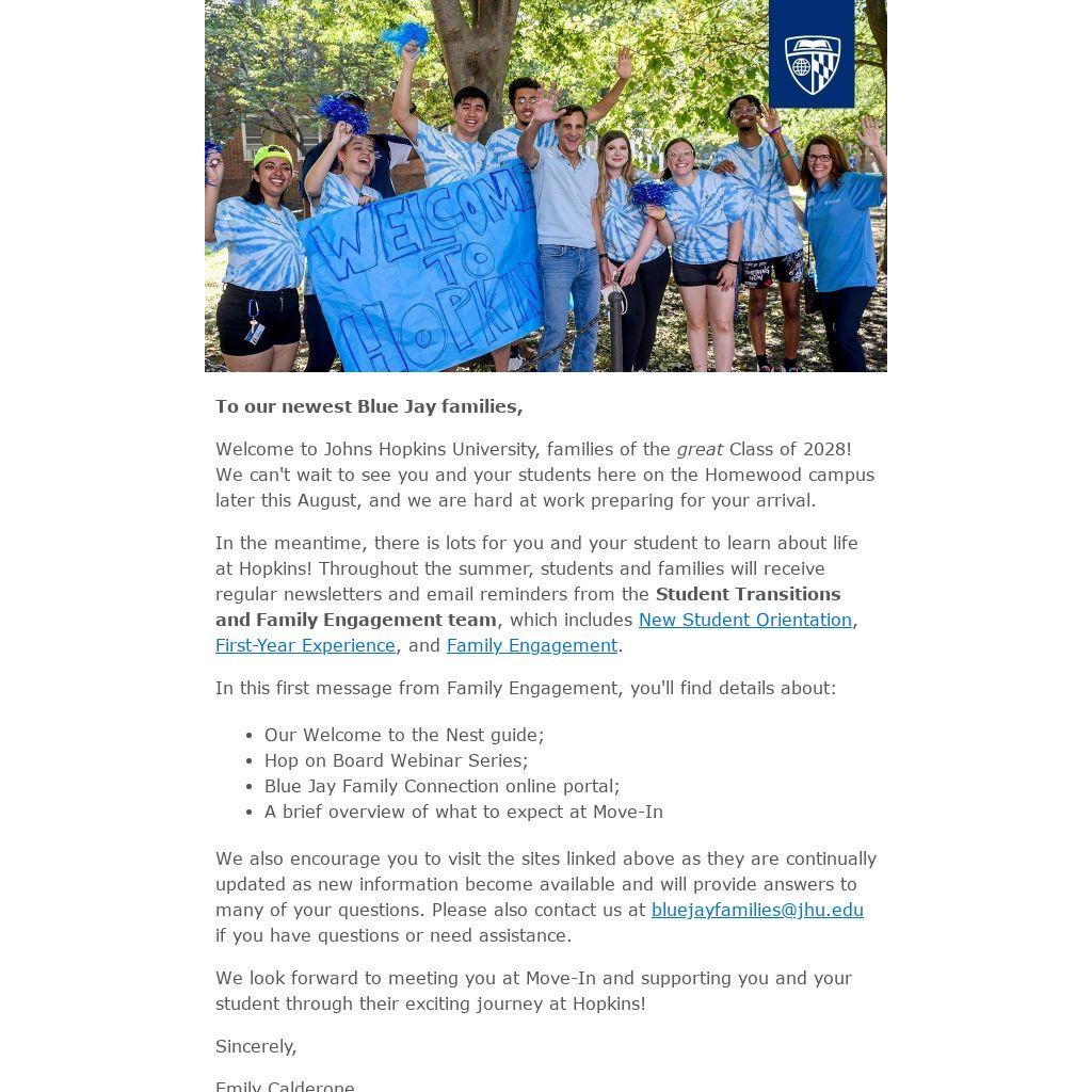Welcome to Johns Hopkins University, families of the great Class of 2028! We can't wait to see you and your students here on the Homewood campus later this August, and we are hard at work preparing for your arrival.