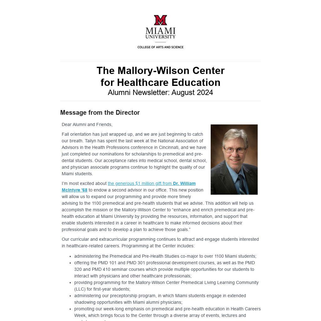 I’m most excited about the generous $1 million gift from Dr. William McIntyre '68 to endow a second advisor in our office. This new position will allow us to expand our programming and provide more timely advising to the 1100 premedical and pre-health students that we advise. This addition will help us accomplish the mission or the Mallory-Wilson Center to “enhance and enrich premedical and pre-health education at Miami University by providing the resources, information, and support that enable students interested in a career in healthcare to make informed decisions about their professional goals and to develop a plan to achieve those goals.”