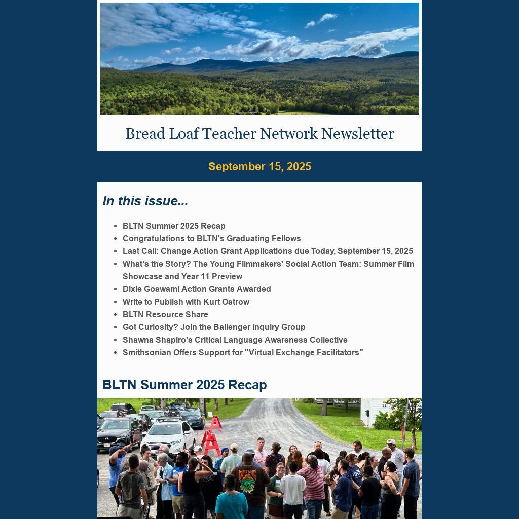 Here's a reminder that the Bread Loaf Teacher Network/Change Initiative Action Grant applications are currently open and due by the end of the day TODAY, September 15, 2025.