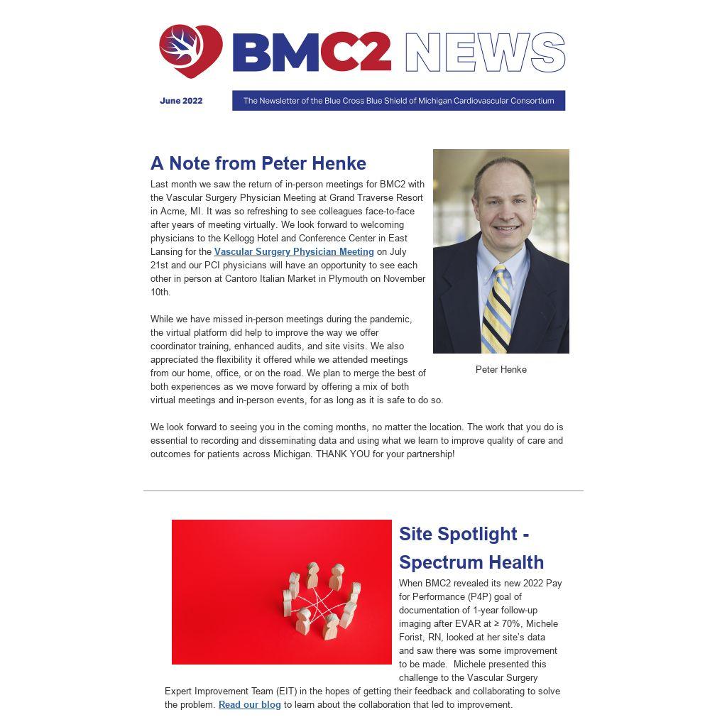 Last month we saw the return of in-person meetings for BMC2 with the Vascular Surgery Physician Meeting at Grand Traverse Resort in Acme, MI. It was so refreshing to see colleagues face-to-face after years of meeting virtually. We look forward to welcoming physicians to the Kellogg Hotel and Conference Center in East Lansing for the Vascular Surgery Physician Meeting on July 21st and our PCI physicians will have an opportunity to see each other in person at Cantoro Italian Market in Plymouth on November 10th.
