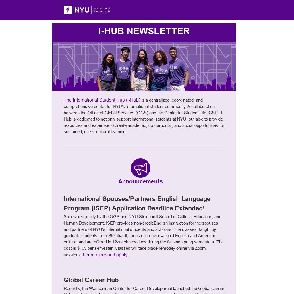 The International Student Hub (I-Hub) is a centralized, coordinated, and comprehensive center for NYU’s international student community. A collaboration between the Office of Global Services (OGS) and the Center for Student Life (CSL), I-Hub is dedicated to not only support international students at NYU, but also to provide resources and expertise to create academic, co-curricular, and social opportunities for sustained, cross-cultural learning.