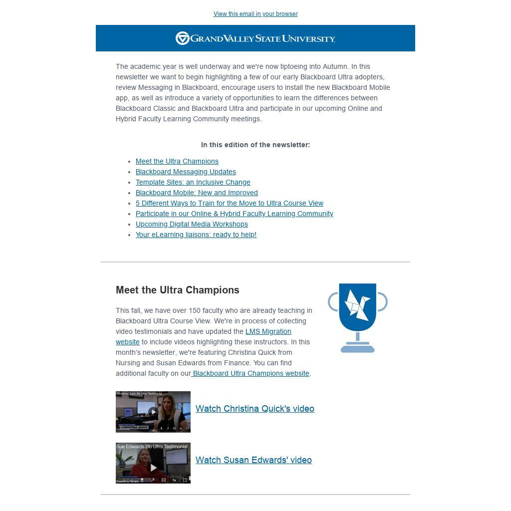 The academic year is well underway and we're now tiptoeing into Autumn. In this newsletter we want to begin highlighting a few of our early Blackboard Ultra adopters, review Messaging in Blackboard, encourage users to install the new Blackboard Mobile app, as well as introduce a variety of opportunities to learn the differences between Blackboard Classic and Blackboard Ultra and participate in our upcoming Online and Hybrid Faculty Learning Community meetings.