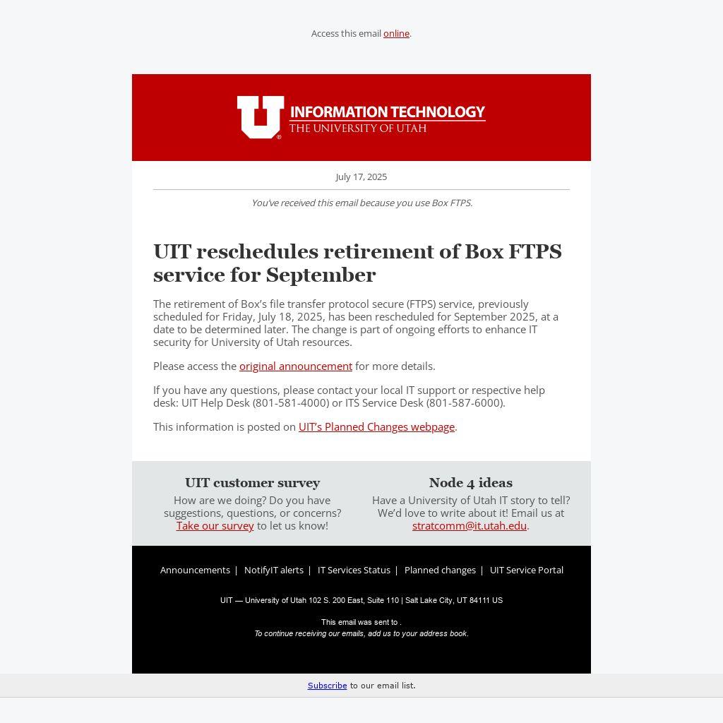 The retirement of Box’s file transfer protocol secure (FTPS) service, previously scheduled for Friday, July 18, 2025, has been rescheduled for September 2025, at a date to be determined later. The change is part of ongoing efforts to enhance IT security for University of Utah resources.