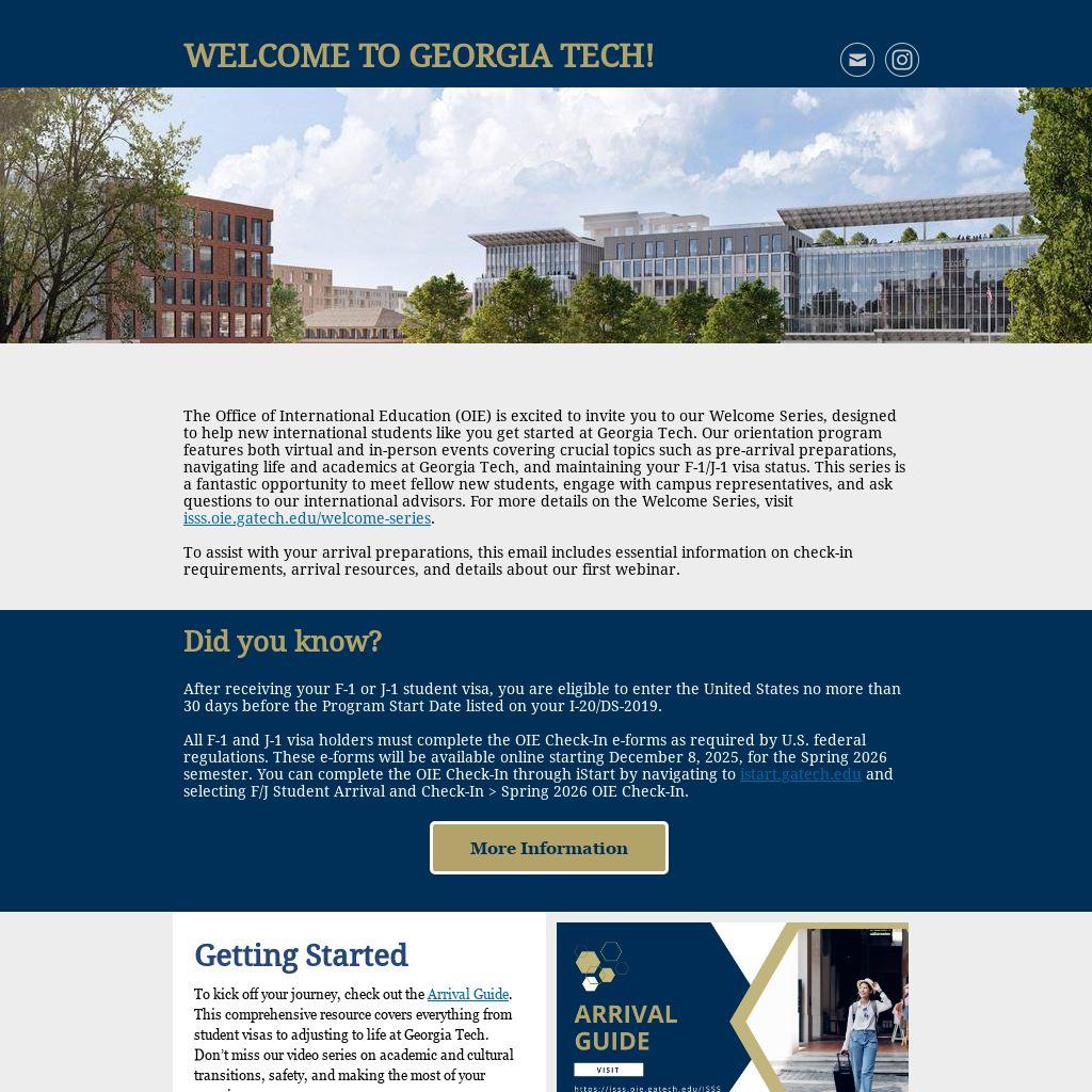 The Office of International Education (OIE) is excited to invite you to our Welcome Series, designed to help new international students like you get started at Georgia Tech. Our orientation program features both virtual and in-person events covering crucial topics such as pre-arrival preparations, navigating life and academics at Georgia Tech, and maintaining your F-1/J-1 visa status. This series is a fantastic opportunity to meet fellow new students, engage with campus representatives, and ask questions to our international advisors. For more details on the Welcome Series, visit isss.oie.gatech.edu/welcome-series.Â