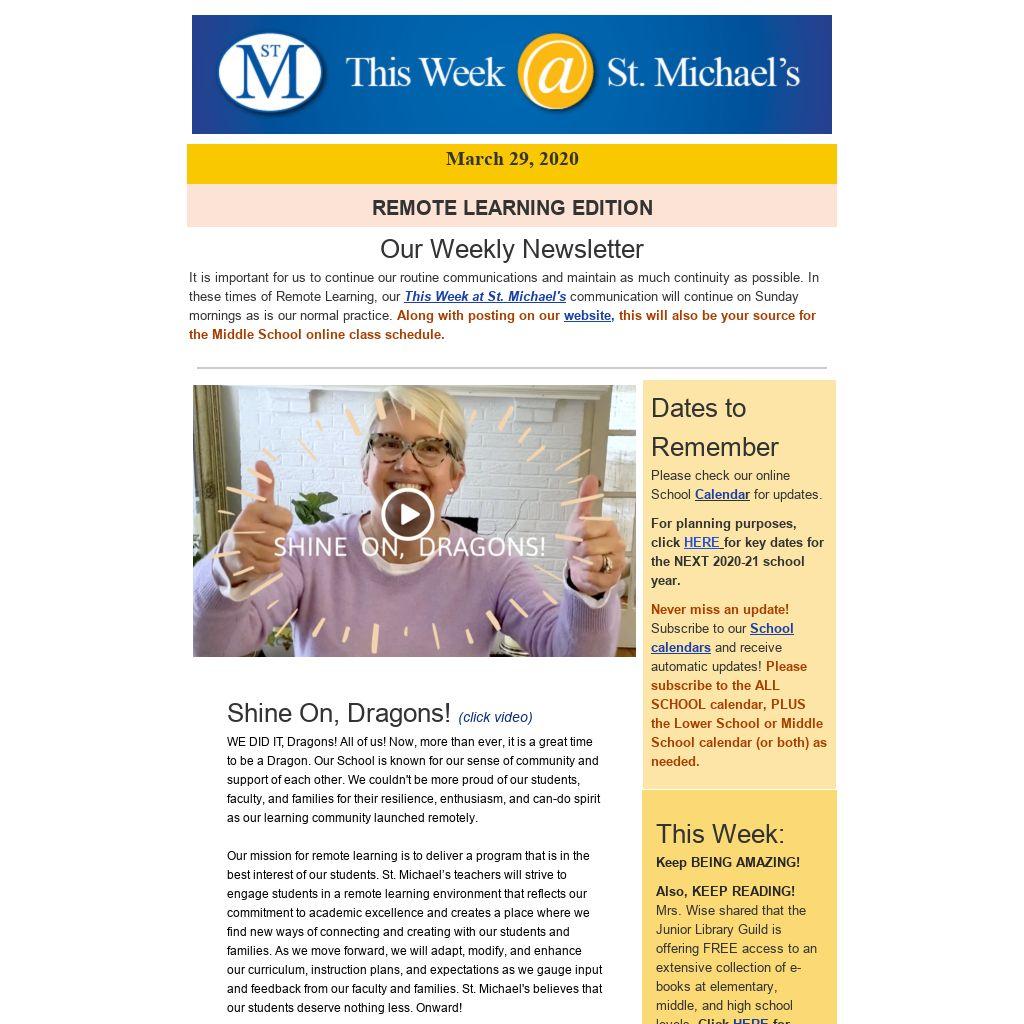 Our mission for remote learning is to deliver a program that is in the best interest of our students. St. Michael’s teachers will strive to engage students in a remote learning environment that reflects our commitment to academic excellence and creates a place where we find new ways of connecting and creating with our students and families. As we move forward, we will adapt, modify, and enhance our curriculum, instruction plans, and expectations as we gauge input and feedback from our faculty and families. St. Michael's believes that our students deserve nothing less. Onward!