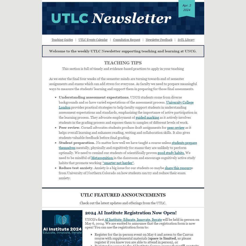 Welcome to the weekly UTLC Newsletter supporting teaching and learning at UNCG.