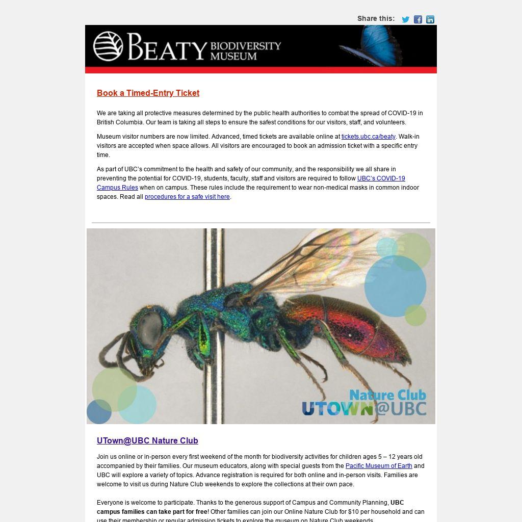 | About the Museum The Beaty Biodiversity Museum is Vancouver's natural history museum, dedicated to building greater understanding, and a shared sense of community and wonder, around biodiversity. Follow us on our social media channels!