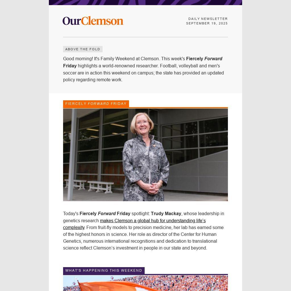Good morning! It's Family Weekend at Clemson. This week's Fiercely Forward Friday highlights a world-renowned researcher. Football, volleyball and men's soccer are in action this weekend on campus; the state has provided an updated policy regarding remote work.