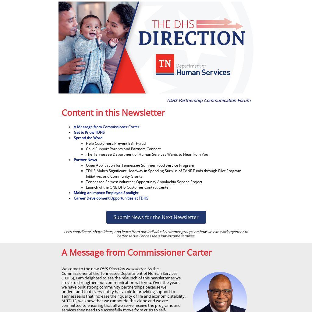 Welcome to the new DHS Direction Newsletter. As the Commissioner of the Tennessee Department of Human Services (TDHS), I am delighted to see the relaunch of this newsletter as we strive to strengthen our communication with you. Over the years, we have built strong community partnerships because we understand that every entity has a role in providing support to Tennesseans that increase their quality of life and economic stability. At TDHS, we know that we cannot do this alone and we are committed to ensuring that all we serve receive the programs and services they need to successfully move from crisis to self-sufficiency.